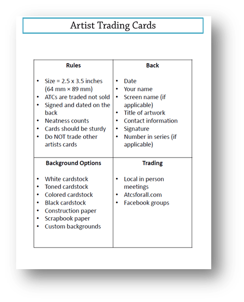 This video will show you how to set up your file to print out an a6 ca. They work with freelance artists, illustrators and ghostwriters to create original artwork. As the name suggests, this is a group for those who wish to swap artist trading cards with others in the united kingdom. This will make cutting your cards much easier. The artist trading card rules are as follows. Brainstorm and make preliminary sketches. You can produce different effects depending on whether you leave it to dry naturally or use a heat gun, which can cause streaks of colour to run across the card and into each other. This allows them to fit into the plastic sleeves in which they are stored. The quality of your greeting cards can help them sell, so use the proper paper. Our goal is to assist bands, artists and dj's with. If you really want to show off your 50 great paintings, then print 50 great different business cards and let people chose which business card they want to take from you. It might be one of many things, and one of those might be completely drawing a black. You might want to have a stamp made with your contact information so you don't have to write it all by hand on the back of each card if you are producing many cards.